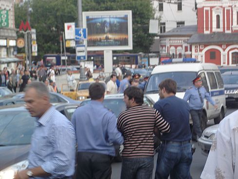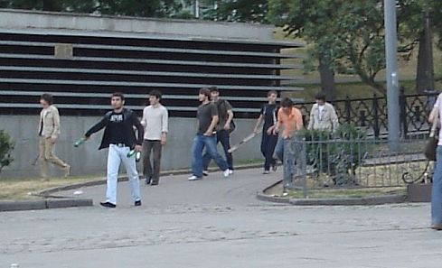 Далее, исходя из логических соображений, националисты должны были появиться в каком-либо другом месте скопления мирно отдыхающих кавказцев и спровоцировать там потасовку. Но все произошло ровно наоборот. Около 21 часа перед памятником Кириллу и Мефодию на Славянской площади появилась группа кавказцев, которая стала танцевать свои народные танцы и в целом шумно себя вести, что, в принципе, можно было расценивать как хулиганство и провокацию по отношению к отдыхающим в окрестностях гражданам. А, учитывая тот факт, что уже некоторое время в Ильинском сквере у памятника Героям Плевны, что чуть выше по Лубянскому проезду патриотами был организован православный патруль (о чем можно было узнать из патриотических сайтов), то предположение о злонамеренности и провокационности плясок у памятника христианским просветителям становится еще более логичным. Провокация удалась – какой-то возмущенный человек попытался усовестить расшумевшихся хулиганов. Началась словесная перепалка, потом потасовка, на выручку своему товарищу поспешили его друзья, кавказцы ретировались в сторону метро. И тут началось самое интересное – кавказцы вернулись в большем составе, теперь уже вооруженные арматурой. На видео, снятом подоспевшим на место событий оператором ДПНИ и случайно оказавшимися на этом месте прохожими (например: http://dmitryhorse.livejournal.com/), видно, как по Славянской площади и по Лубянскому проезду бегают люди с арматурой. Четко видно, кто именно вооруже, а кто вынужден убегать от озверевшей вооруженной толпы. И судя по видеосъемкам более весомые «аргументы» имела именно кавказская сторона – в то время, как одинокие группки русских патриотов вынуждены были обороняться голыми руками. О вооруженности и агрессивности кавказцев говорили и посетители открытого кафе, расположенного на Славянской площади, также пострадавшие от немотивированной агрессии «восточных братьев». - Так кто реально был подготовлен? – Кто организовал бойню? Неужели видеосъемка событий менее весомый аргумент (о свидетелях и говорить тогда не стоит), чем предвзятое отношение чиновника?