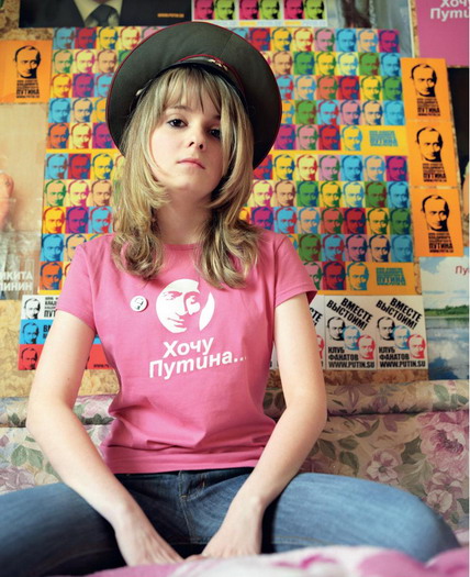 Алина Комарова, студентка Московского педагогического государственного университета, 19 лет: «Впервые я узнала о Путине, когда Ельцин о нем заявил. Я изучила его личностные качества, биографию, потом он стал интересен мне как личность. У меня в комнате над столом висит российский флаг с Путиным. А над кроватью — постер с его изображением. Еще у меня есть несколько разных футболок с портретом Путина, есть открытки и много наклеек. Каждый день я просматриваю публикации в прессе, в интернете, узнаю из газет о событиях в его политической и личной жизни».