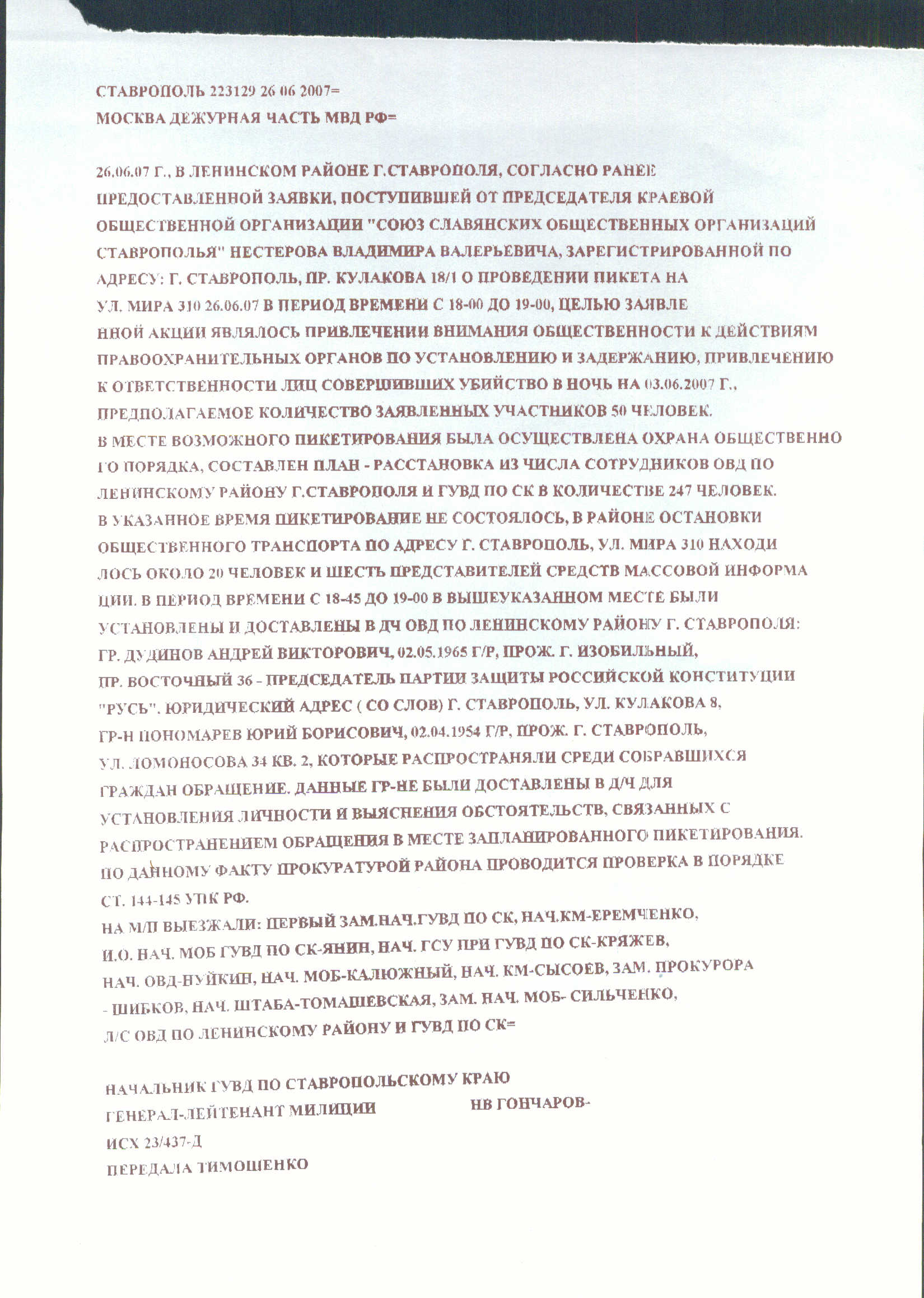 26.06.07 г.. В Ленинском районе г.Ставрополя, согласно ранее предоставленной заявки, поступившей от председателя краевой общественной организации "Союз славянских общественных организаций Ставрополья" Нестерова Владимира Валерьевича, зарегистрированной по адресу: г. Ставрополь, пр. Кулакова 18/1 о проведении пикета на ул. Мира 3.10 26.06.07 в период времени с 18-00 до 19-00, целью заявленной акции являлось привлечении внимания общественности к действиям правоохранительных органов по установлению и задержанию, привлечению к ответственности лиц совершивших убийство в ночь на 03.06.2007 г.. Предполагаемое количество заявленных участников 50 человек. В месте возможного пикетирования была осуществлена охрана общественного порядка, составлен план - расстановка из числа сотрудников ОВД по Ленинскому району г.Ставрополя и ГУВД по СК в количестве 247 человек. В указанное время пикетирование не состоялось, в районе остановки общественного транспорта по адресу г. Ставрополь, ул. Мира 310 находилось около 20 человек и шесть представителей средств массовой информации. В период времени с 18-45 до 19-00 в вышеуказанном месте были установлены и доставлены в ДЧ ОВД по Ленинскому району г. Ставрополя: гр. Дудинов Андрей Викторович, 02.05.1965 г/р, прож г. Изобильный, пр. Восточный 36 - председатель партии защиты российской конституции "Русь". Юридический адрес ( со слов) г. Ставрополь, ул. Кулакова 8. Гр-н Пономарев Юрий Борисович, 02.04.1954 г/р, прож. Г. Ставрополь, ул. Ломоносова 34 кв. 2, которые распространяли среди собравшихся граждан обращение. Данные гр-не были доставлены в Д/Ч для установления личности и выяснения обстоятельств, связанных с распространением обращения в месте запланированного пикетирования. По данному факту прокуратурой района проводится проверка в порядке ст. 144 145 УПК РФ.