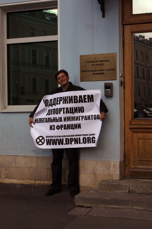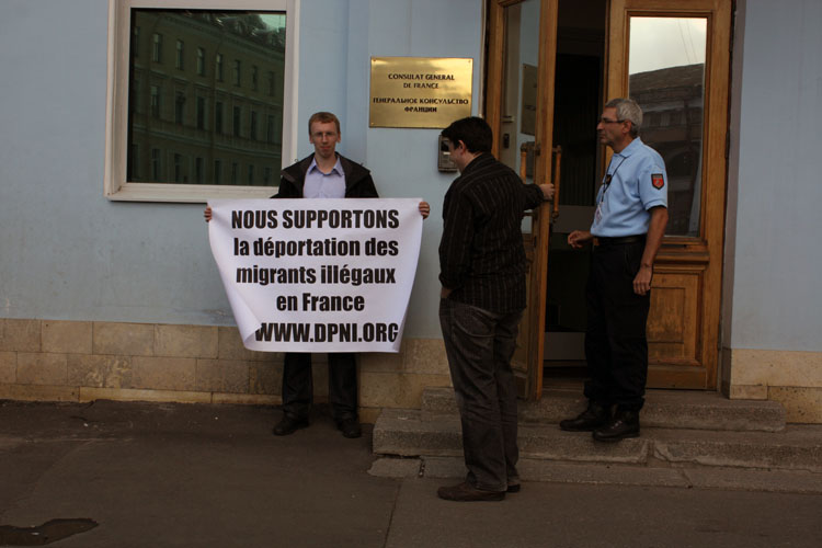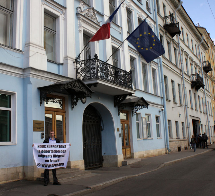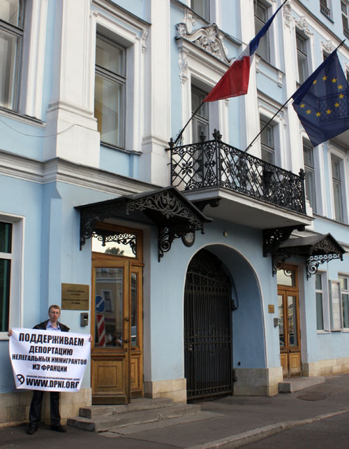 Сегодня же в Санкт-Петербурге в 13:00 представителями ДПНИ была подана петиция к Генеральному Консулу Франции в Петербурге Мишелю Обри, а также непосредственно у консульства проведён одиночный пикет в поддержку депортации нелегальных иммигрантов из Франции.