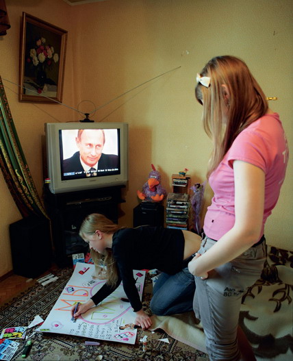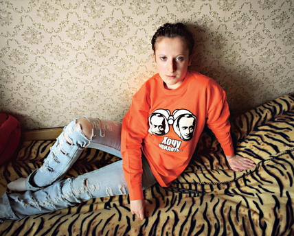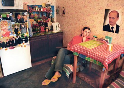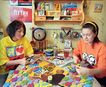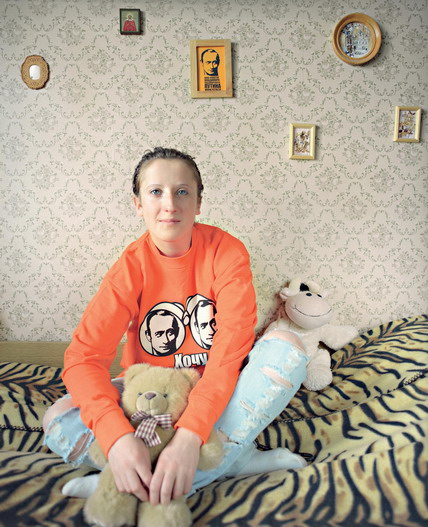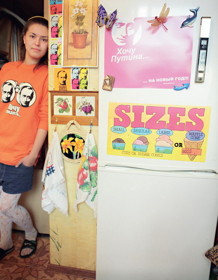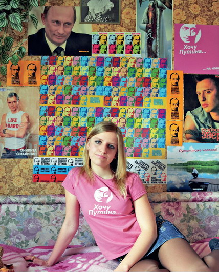 Алина Комарова, студентка Московского педагогического государственного университета, 19 лет: «Впервые я узнала о Путине, когда Ельцин о нем заявил. Я изучила его личностные качества, биографию, потом он стал интересен мне как личность. У меня в комнате над столом висит российский флаг с Путиным. А над кроватью — постер с его изображением. Еще у меня есть несколько разных футболок с портретом Путина, есть открытки и много наклеек. Каждый день я просматриваю публикации в прессе, в интернете, узнаю из газет о событиях в его политической и личной жизни».