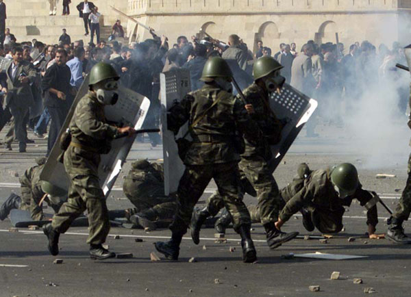 В ночь с 15 на 16 октября активисты партии «Йени мюсават» вышли на улицы города и прошли от кинотеатра «Гялябя» по всему центру города. Лучше назвать все своими словами – их действия были четкими и запланированными заранее и больше подходили под определение «восстание». По приказу министра обороны в город были выпущены войска спецназа. МВД также не осталось в долгу и на утро на месте событий оказались ОПОНовцы, которые постарались очистить улицы от мусаватистов. Должен сказать, меры, предпринятые официальной властью, оказались недостаточными. Ночью центр города был разбит, и больше напоминал кадры разрушенного города из какого-нибудь третьесортного боевика. К счастью, до пригородов, где и проживает костяк русского населения, эта волна не докатилась. Днем мусаватисты, и представители Народного Фронта собрались на площади Азадлыг перед Домом Правительства и начали проводить митинг, где говорилось о продажности и преступности власти семьи Алиевых, о том, что им помогают русские, и русских из Баку надо насильственно депортировать, а то и вовсе уничтожить. К трем часам дня между митингующими и полицейскими произошла потасовка, которая вылилась в самую настоящую войну. Ослепленные кровью азербайджанские националисты начали без разбора нападать на всех мирных прохожих, уже даже не взирая на национальность людей.