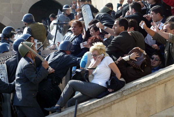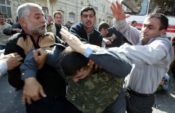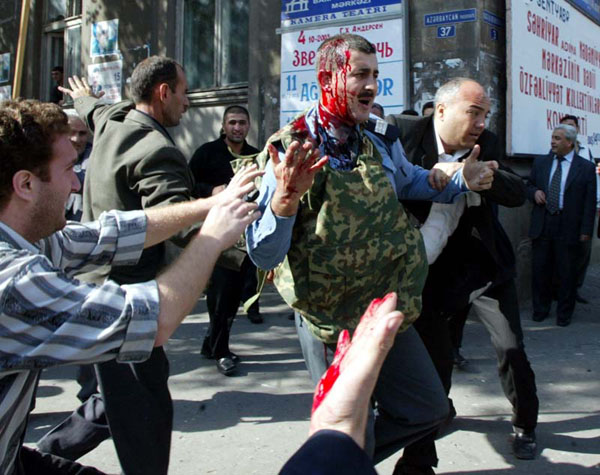 Приблизительно к 22:00 трансляция ЦИК прервалась. Выступал лидер новых мусаватистов Иса Гамбар. Брюзжа слюной и крича, этот маргинал говорил о том, что на выборах произошла подтасовка, Ильхам Алиев пришел к власти нелегитимно и требовал пересмотра всех итогов выборов. Он усматривал во всем этом «кровавую руку Москвы, которая дотянулась до горла Азербайджана и душит его свободу, независимость и демократию». И повинны во всем этом именно русские жители Азербайджана. Мне, как русскому, было очень неприятно слушать выкрики этого люмпена и я решил выйти из сего заведения, так сказать подышать свежим воздухом. Выйдя из кафе, я опешил от увиденной сцены. Несколько десятков бородатых молодчиков, кричащих «Истефа!» («Свобода!»), переворачивающих автомобили, громящих витрины магазинов и избивающих прогуливающихся людей со славянской внешностью, то есть русских, потому как единственными представителями славян в Баку являются только русские. На моих глазах толпа этих ублюдков убила русского парня, который видимо, не успел уйти с места событий. Несколько полицейских, оказавшихся рядом только разводили руками, они не могли и не собирались спасать несчастного. Не знаю, может, благодаря моим немного темным чертам лица мне и удалось избежать той же участи, что постигла моего соотечественника. Уйти с улицы и добраться до метро мне помогли мои друзья-азербайджанцы, которые быстро сориентировались и поняли, что ничем хорошим сие событие не окончится.