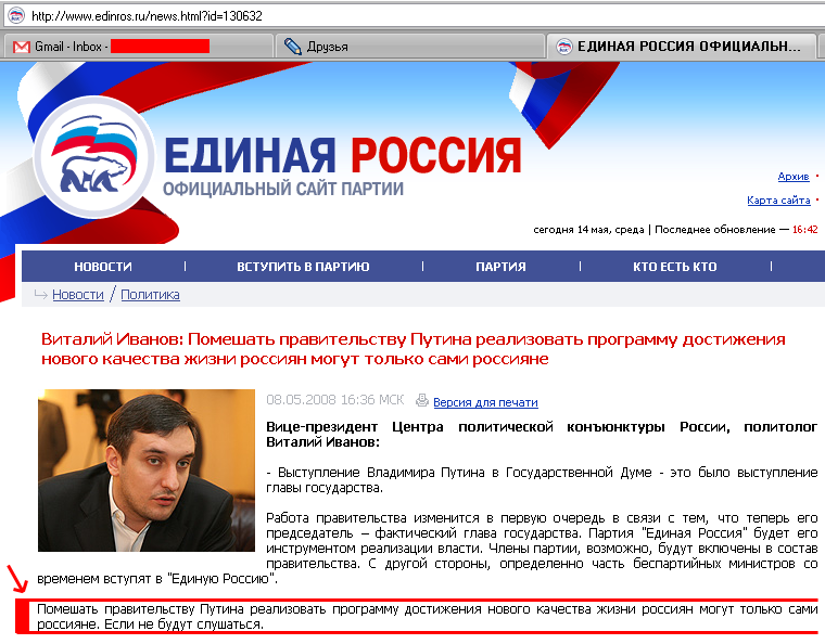 На официальном сайте партии "Единая Россия" вице-президент Центра политической конъюнктуры России, политолог Виталий Иванов сообщил:
