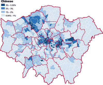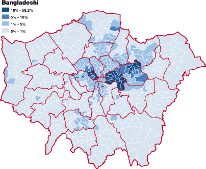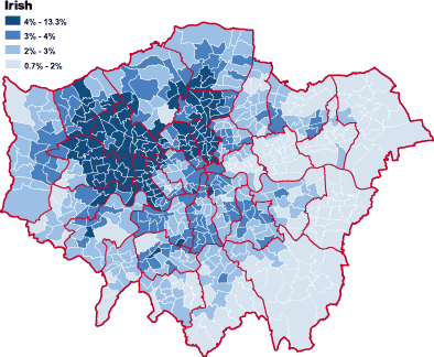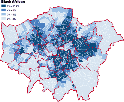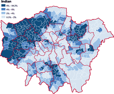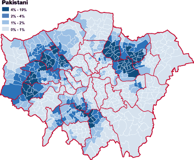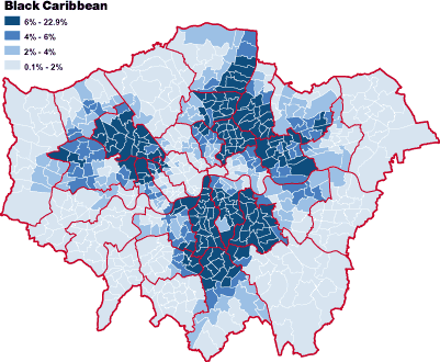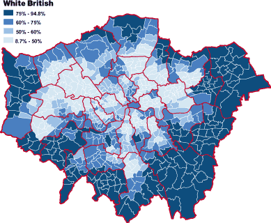 На этой карте Лондона показана плотность населения коренных жителей британской столицы - белых англичан. Как видите, на окраинах их ещё большинство, а в центре города их уже вытеснили выходцы из Азии и Африки: