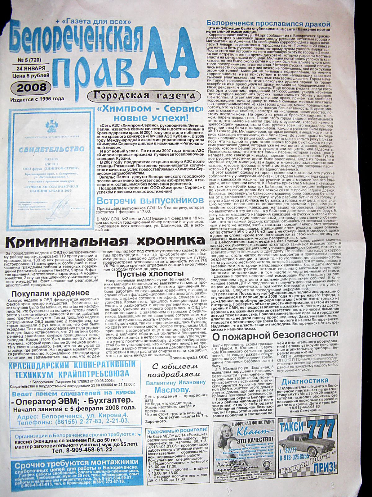 Местная газета "Белореченская правда" написала с Вашего сайта о произошедшем, газету Вам отослал.