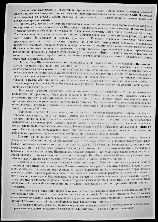 Активность русской молодежи Белореченска, активно распространявшая правдивую информацию о происшедших событиях, принесла результаты. Житель Белореченска пишет в своем письме в редакцию ДПНИ.ОРГ: Листовки, расклеенные по всему городу произвели эффект разорвавшейся бомбы, говорят сами менты(!), что отбирают их даже в местах где делают ксерокопии. По сообщениям наших корреспондентов, обстановка в городе неспокойная, больше всего местные власти боятся допустить обострения ситуации, возможно поэтому местная пресса стала более объективно освещать ситуацию.