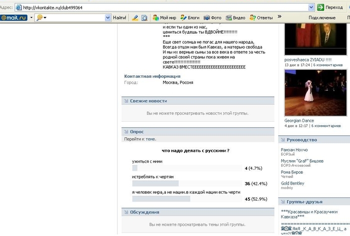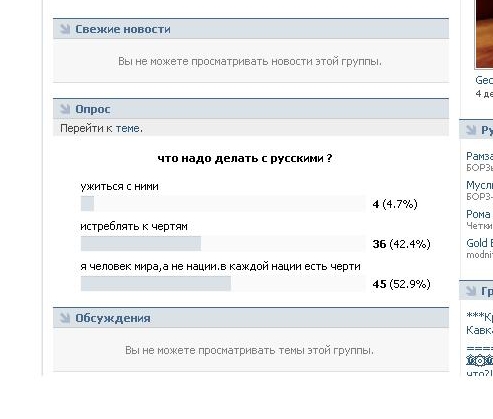 Впрочем, общаясь между собой, они этого и не собираются скрывать. Например, на страницах ресурса "vkonakte.ru" появился занятный опрос под названием "что делать с русскими", не больше и не меньше! Характерно, что пункт опроса , который назывался "ужиться с ними" , выбрали лишь 4% из участвовавших вопросе, а зато "истреблять к чертям" - 42%. Справедливости ради надо сказать, что чуть больше половины ответило достаточно нейтрально. Впрочем, сама форма "нейтрального" вопроса, лишь подтверждают тот факт, что кавказцы ощущают свое отличие от окружающего их русского большинства, причем это отличие для них не является чем то неудобным. Наоборот - это повод для самоутверждения, фактор позволяющий обрести свою идентичность, идентичность, основанную на противопоставлении своей национально-религиозной общности и коренного населения.Кроме того, в тот период массовая миграция отсутствовала, что не приводило к перемешиванию населения и образования этнических анклавов на русской территории.