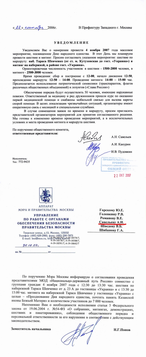 30 октября, в 18:00 представителями Оргкомитета по подготовке "Русского Марша-2007" было получено официальное письменное разрешение мэрии Москвы на проведение шествия и митинга по ранее указанным маршрутам.