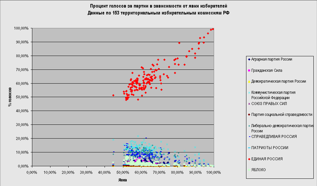 О чем это говорит? О том, что там, там, куда сгоняли силком или подкупали, народ голосовал за так называемую «партию власти». Там, куда люди шли сами, без дополнительных стимулов, голосовали против «Единой России». Кроме того, отмечено, что там, где явка увеличивалась, практически линейно увеличивался и процент «за» «единороссов» (так, как, например, в Чечне: 99% и 99%). Это "может" означать только то, что вбрасывались бюллетени, или просто дорисовывались цифры, причем только за одну партию.